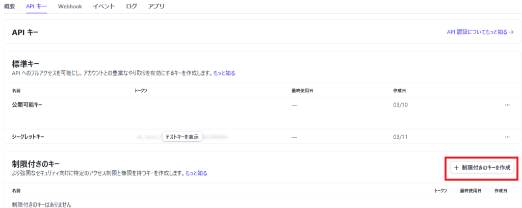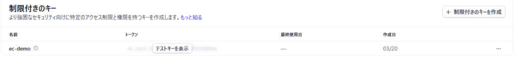 テストなのでシークレットキーをそのまま使ってもいいのですが、今回はきちんと制限付きのキーを作成するようにします。